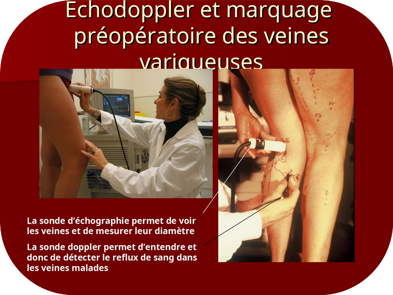 Le doppler détecte par un signal sonore les veines dans lesquelles le sang reflue vers le bas au lieu de monter vers le coeur. En pratique, il consiste à appliquer sur la peau, le long du trajet habituel des veines une sonde ayant la forme d’un stylo. Le son caractéristique du reflux, est amplifié par « le signal doppler », au besoin même enregistré sous forme d’un graphique.
